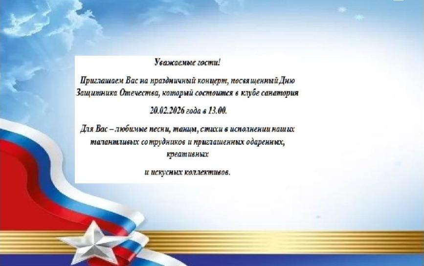 Филиал "Санаторий "Лазурный берег" приглашает гостей на праздничный концерт посвященный празднованию Дня Защитника Отечества!